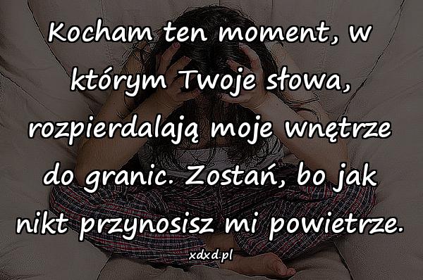 Kocham ten moment, w którym Twoje słowa, rozpierdalają moje wnętrze do granic. Zostań, bo jak nikt przynosisz mi powietrze.