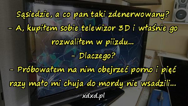 Sąsiedzie, a co pan taki zdenerwowany? – A, kupiłem sobie telewizor 3D i właśnie go rozwaliłem w piizdu… – Dlaczego? – Próbowałem na nim obejrzeć porno i pięć razy mało mi chuja do mordy nie wsadzili…