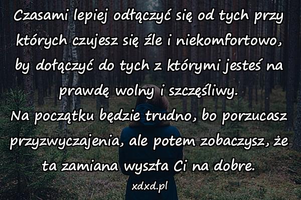Czasami lepiej odłączyć się od tych przy których czujesz się źle i niekomfortowo, by dołączyć do tych z którymi jesteś na prawdę wolny i szczęśliwy. Na początku będzie trudno, bo porzucasz przyzwyczajenia, ale potem zobaczysz, że ta zamiana wyszła Ci na dobre.