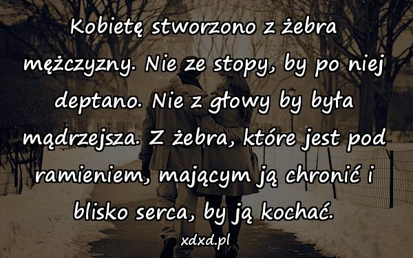 Kobietę stworzono z żebra mężczyzny. Nie ze stopy, by po niej deptano. Nie z głowy by była mądrzejsza. Z żebra, które jest pod ramieniem, mającym ją chronić i blisko serca, by ją kochać.