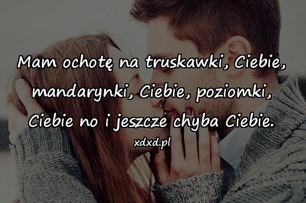 Home Cytaty Cytaty o miłości Mam ochotę na Ciebie 3 lata ago 3 lata ago Cytaty o miłości Mam ochotę na Ciebie autor: admin 60wyświetleń 812 812 points Mam ochotę na truskawki, Ciebie, mandarynki, Ciebie, poziomki, Ciebie no i jeszcze chyba Ciebie. Pobierz obrazek Post PaginationPoprzedniPreviousNastępnyNext aforyzmy, besty, cytat, cytaty, cytaty o miłości, facebook, fejs, lovsy, mem, memy, miłość, obrazki, pragnienia, sentencje, tablica, te myśli, uczucia, wklejka, wyznanie miłosne Twoja reakcja? zmieszany 0 zmieszany porażka 0 porażka zabawne 0 zabawne zły 0 zły miłośc 0 miłośc fajne 0 fajne lol 0 lol omg 0 omg 0 komentarzy Anuluj pisanie odpowiedziTwój adres e-mail nie zostanie opublikowany. Wymagane pola są oznaczone * Zapamiętaj moje dane w tej przeglądarce podczas pisania kolejnych komentarzy.