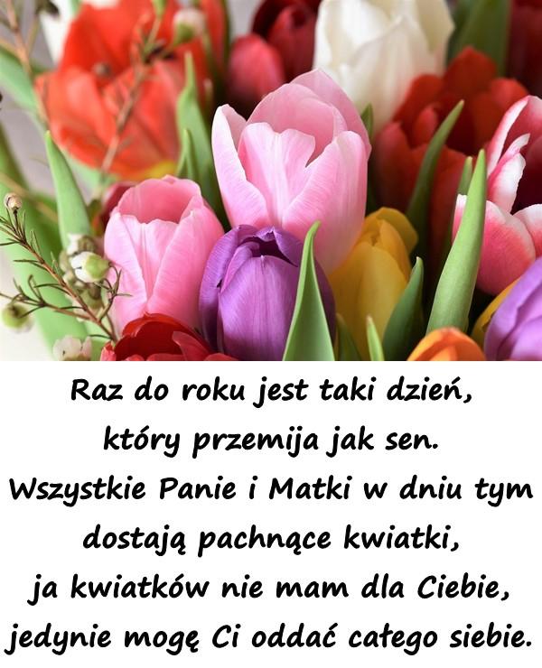 Raz do roku jest taki dzień, który przemija jak sen. Wszystkie Panie i Matki w dniu tym dostają pachnące kwiatki, ja kwiatków nie mam dla Ciebie, jedynie mogę Ci oddać całego siebie.