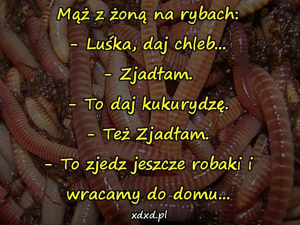 Mąż z żoną na rybach: – Luśka, daj chleb… – Zjadłam. – To daj kukurydzę. – Też Zjadłam. – To zjedz jeszcze robaki i wracamy do domu…