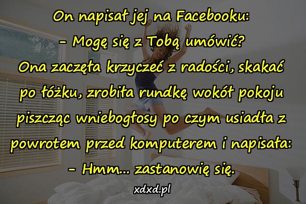 On napisał jej na Facebooku: – Mogę się z Tobą umówić? Ona zaczęła krzyczeć z radości, skakać po łóżku, zrobiła rundkę wokół pokoju piszcząc wniebogłosy po czym usiadła z powrotem przed komputerem i napisała: – Hmm… zastanowię się.