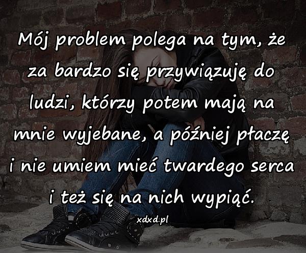 Mój problem polega na tym, że za bardzo się przywiązuję do ludzi, którzy potem mają na mnie wyjebane, a później płaczę i nie umiem mieć twardego serca i też się na nich wypiąć.