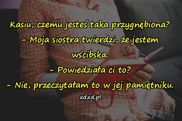 Kasiu, czemu jesteś taka przygnębiona? – Moja siostra twierdzi, że jestem wścibska. – Powiedziała ci to? – Nie, przeczytałam to w jej pamiętniku.