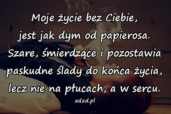 Moje życie bez Ciebie, jest jak dym od papierosa. Szare, śmierdzące i pozostawia paskudne ślady do końca życia, lecz nie na płucach, a w sercu.