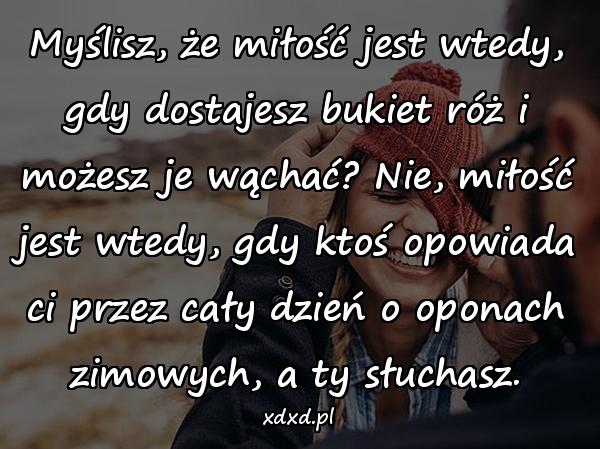 Myślisz, że miłość jest wtedy, gdy dostajesz bukiet róż i możesz je wąchać? Nie, miłość jest wtedy, gdy ktoś opowiada ci przez cały dzień o oponach zimowych, a ty słuchasz.
