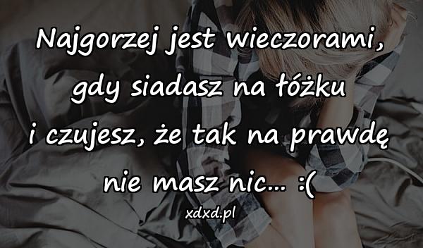 Home Cytaty Cytaty o życiu Najgorzej jest wieczorami 1 rok ago 1 rok ago Cytaty o życiu Najgorzej jest wieczorami autor: admin 22wyświetlenia 816 816 points Najgorzej jest wieczorami, gdy siadasz na łóżku i czujesz, że tak na prawdę nie masz nic… 🙁 Pobierz obrazek Post PaginationPoprzedniPreviousNastępnyNext aforyzmy, besty, cytat, cytaty, cytaty o życiu, mem, memy, obrazki, samopoczucie, samotność, sentencje, życie Twoja reakcja? zmieszany 0 zmieszany porażka 0 porażka zabawne 0 zabawne zły 0 zły miłośc 0 miłośc fajne 0 fajne lol 0 lol omg 0 omg 0 komentarzy Anuluj pisanie odpowiedziTwój adres e-mail nie zostanie opublikowany. Wymagane pola są oznaczone * Zapamiętaj moje dane w tej przeglądarce podczas pisania kolejnych komentarzy.