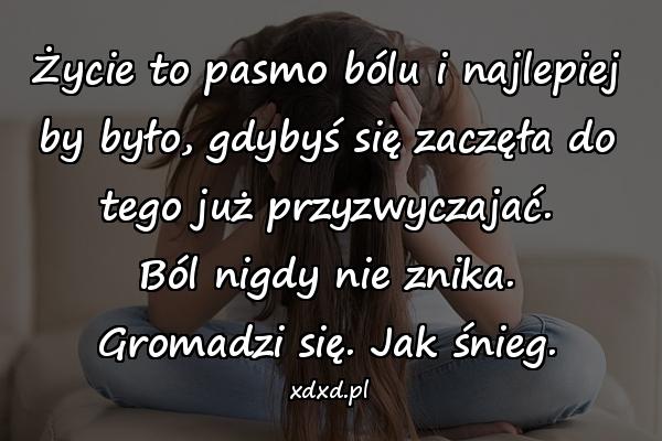 Życie to pasmo bólu i najlepiej by było, gdybyś się zaczęła do tego już przyzwyczajać. Ból nigdy nie znika. Gromadzi się. Jak śnieg.