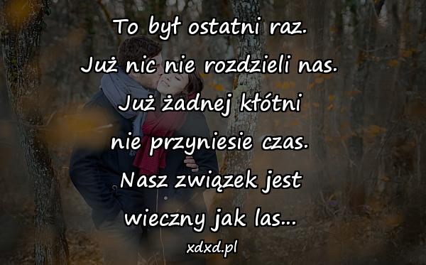 To był ostatni raz. Już nic nie rozdzieli nas. Już żadnej kłótni nie przyniesie czas. Nasz związek jest wieczny jak las…