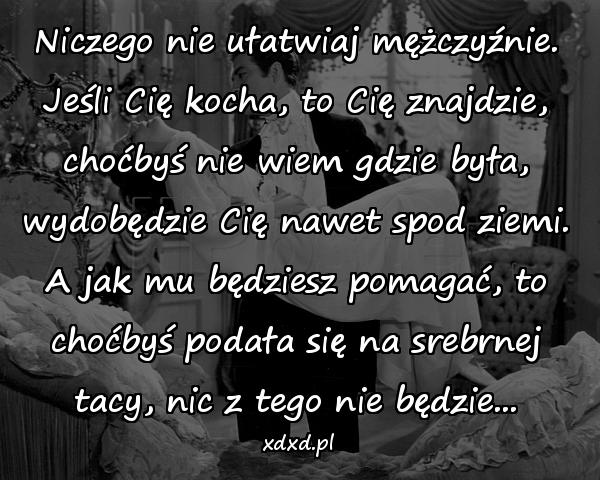 Niczego nie ułatwiaj mężczyźnie. Jeśli Cię kocha, to Cię znajdzie, choćbyś nie wiem gdzie była, wydobędzie Cię nawet spod ziemi. A jak mu będziesz pomagać, to choćbyś podała się na srebrnej tacy, nic z tego nie będzie…