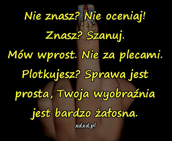 Nie znasz? Nie oceniaj! Znasz? Szanuj. Mów wprost. Nie za plecami. Plotkujesz? Sprawa jest prosta, Twoja wyobraźnia jest bardzo żałosna.