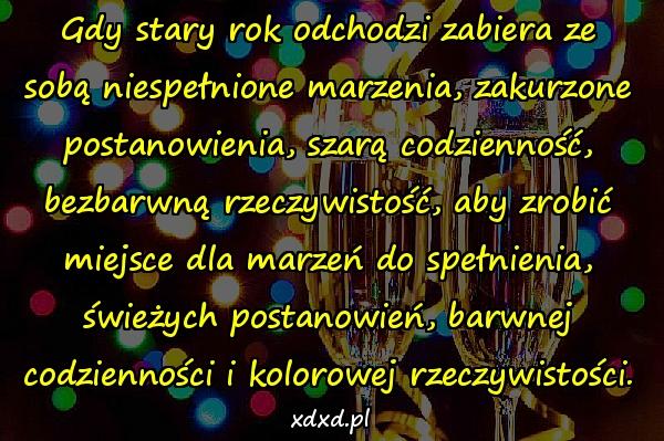 Gdy stary rok odchodzi zabiera ze sobą niespełnione marzenia, zakurzone postanowienia, szarą codzienność, bezbarwną rzeczywistość, aby zrobić miejsce dla marzeń do spełnienia, świeżych postanowień, barwnej codzienności i kolorowej rzeczywistości.