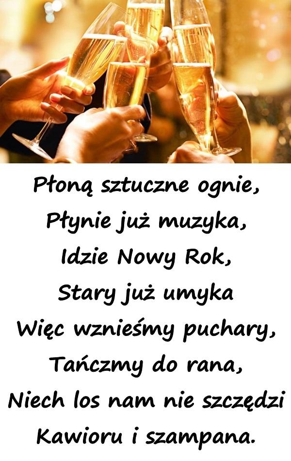 Płoną sztuczne ognie, Płynie już muzyka, Idzie Nowy Rok, Stary już umyka Więc wznieśmy puchary, Tańczmy do rana, Niech los nam nie szczędzi Kawioru i szampana.