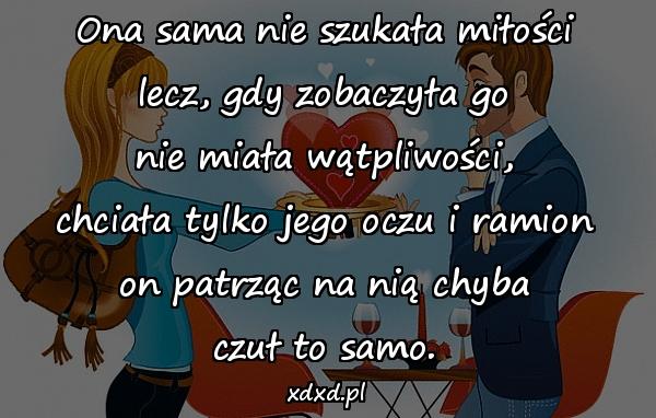 Ona sama nie szukała miłości lecz, gdy zobaczyła go nie miała wątpliwości, chciała tylko jego oczu i ramion on patrząc na nią chyba czuł to samo.