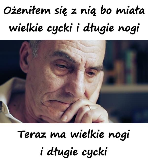 Ożeniłem się z nią bo miała wielkie cycki i długie nogi. Teraz ma wielkie nogi i długie cycki.