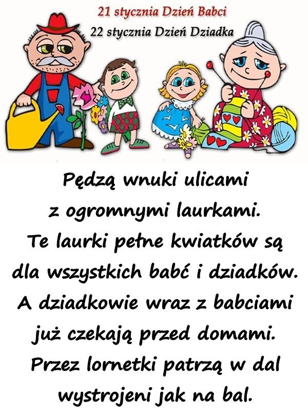 Pędzą wnuki ulicami z ogromnymi laurkami. Te laurki pełne kwiatków są dla wszystkich babć i dziadków. A dziadkowie wraz z babciami już czekają przed domami. Przez lornetki patrzą w dal wystrojeni jak na bal.