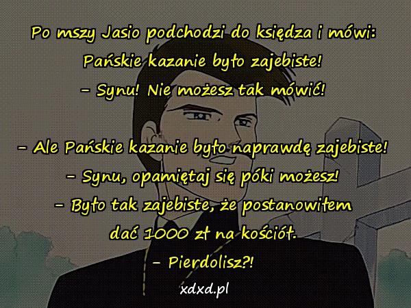 Po mszy Jasio podchodzi do księdza i mówi: Pańskie kazanie było zajebiste! – Synu! Nie możesz tak mówić! – Ale Pańskie kazanie było naprawdę zajebiste! – Synu, opamiętaj się póki możesz! – Było tak zajebiste, że postanowiłem dać 1000 zł na kościół. – Pierdolisz?!