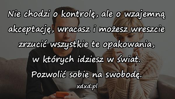 Nie chodzi o kontrolę, ale o wzajemną akceptację, wracasz i możesz wreszcie zrzucić wszystkie te opakowania, w których idziesz w świat. Pozwolić sobie na swobodę.
