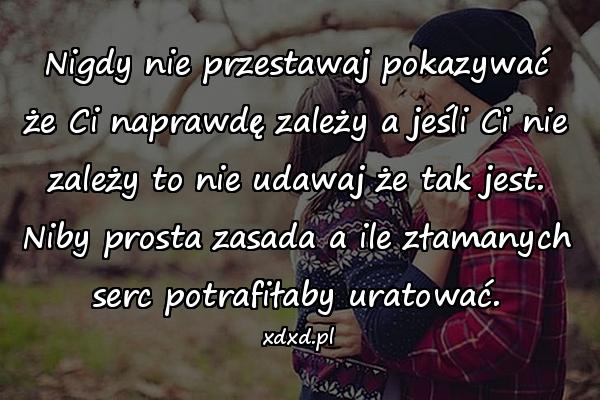 Nigdy nie przestawaj pokazywać że Ci naprawdę zależy a jeśli Ci nie zależy to nie udawaj że tak jest. Niby prosta zasada a ile złamanych serc potrafiłaby uratować.