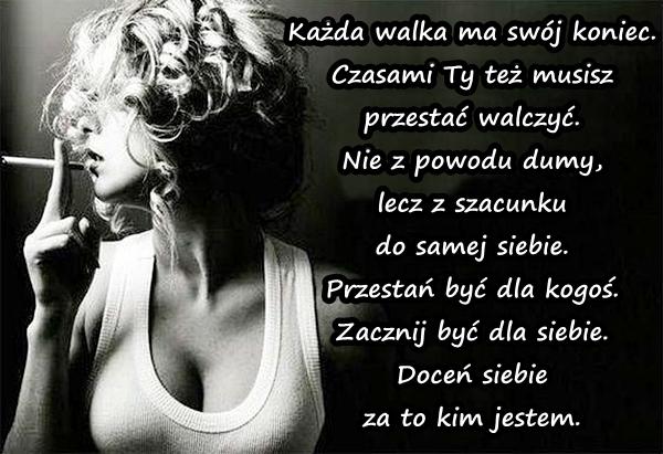 Każda walka ma swój koniec. Czasami Ty też musisz przestać walczyć. Nie z powodu dumy, lecz z szacunku do samej siebie. Przestań być dla kogoś. Zacznij być dla siebie. Doceń siebie za to kim jestem.