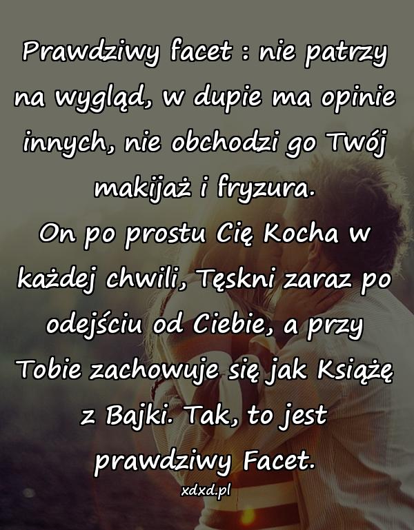 Prawdziwy facet : nie patrzy na wygląd, w dupie ma opinie innych, nie obchodzi go Twój makijaż i fryzura. On po prostu Cię Kocha w każdej chwili, Tęskni zaraz po odejściu od Ciebie, a przy Tobie zachowuje się jak Książę z Bajki. Tak, to jest prawdziwy Facet.