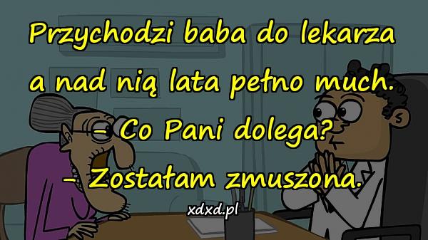 Przychodzi baba do lekarza a nad nią lata pełno much. – Co Pani dolega? – Zostałam zmuszona.