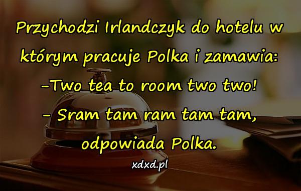 Przychodzi Irlandczyk do hotelu w którym pracuje Polka i zamawia: -Two tea to room two two! – Sram tam ram tam tam, odpowiada Polka.