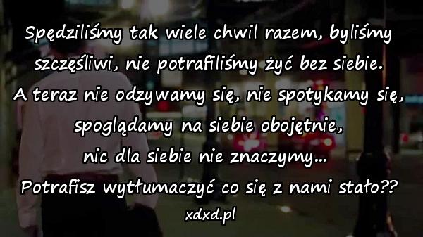 Spędziliśmy tak wiele chwil razem, byliśmy szczęśliwi, nie potrafiliśmy żyć bez siebie. A teraz nie odzywamy się, nie spotykamy się, spoglądamy na siebie obojętnie, nic dla siebie nie znaczymy… Potrafisz wytłumaczyć co się z nami stało??