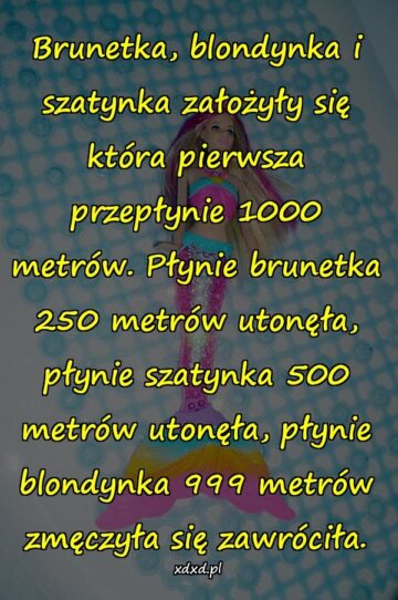 Brunetka, blondynka i szatynka założyły się która pierwsza przepłynie 1000 metrów. Płynie brunetka 250 metrów utonęła, płynie szatynka 500 metrów utonęła, płynie blondynka 999 metrów...