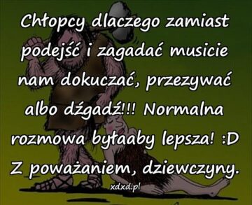 Chłopcy dlaczego zamiast podejść i zagadać musicie nam dokuczać, przezywać albo dźgadź!!! Normalna rozmowa byłaaby lepsza! 😀 Z poważaniem, dziewczyny.