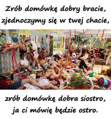850 Śmieszne obrazkiZrób domówkę dobry bracie, zrób domówkę dobra siostroZrób domówkę dobry bracie, zjednoczymy się w twej chacie, zrób domówkę dobra siostro, ja ci mówię będzie ostro.