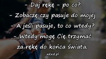 – Daj rękę – po co? – Zobaczę czy pasuje do mojej – A jeśli pasuje, to co wtedy? – Wtedy mogę Cię trzymać za...