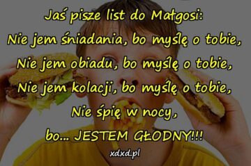Jaś pisze list do Małgosi: Nie jem śniadania, bo myślę o tobie, Nie jem obiadu, bo myślę o tobie, Nie jem kolacji, bo myślę o...