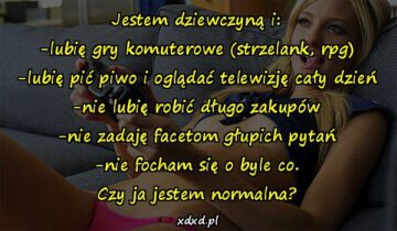Jestem dziewczyną i: -lubię gry komuterowe (strzelank, rpg) -lubię pić piwo i oglądać telewizję cały dzień -nie lubię robić długo zakupów -nie zadaję facetom głupich...