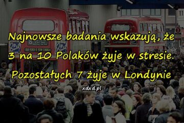 846 Kawały dowcipyNajnowsze badania wskazują, że 3 na 10 Polaków żyjeNajnowsze badania wskazują, że 3 na 10 Polaków żyje w stresie. Pozostałych 7 żyje w Londynie