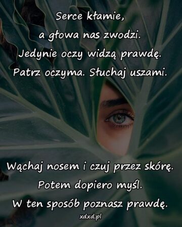Serce kłamie, a głowa nas zwodzi. Jedynie oczy widzą prawdę. Patrz oczyma. Słuchaj uszami. Wąchaj nosem i czuj przez skórę. Potem dopiero myśl. W ten...