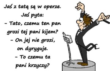 Jaś z tatą są w operze. Jaś pyta: – Tato, czemu ten pan grozi tej pani kijem? – On jej nie grozi, on dyryguje. –...
