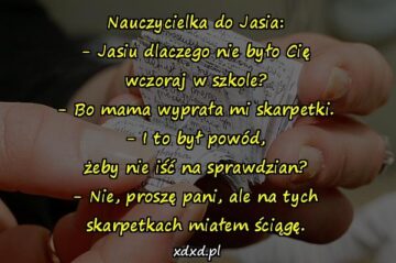 Nauczycielka do Jasia: – Jasiu dlaczego nie było Cię wczoraj w szkole? – Bo mama wyprała mi skarpetki. – I to był powód, żeby nie...