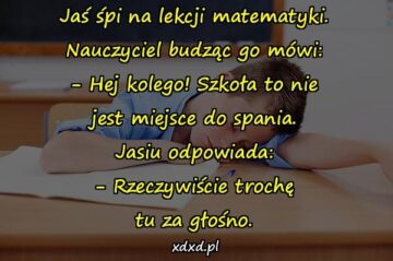 Jaś śpi na lekcji matematyki. Nauczyciel budząc go mówi: – Hej kolego! Szkoła to nie jest miejsce do spania. Jasiu odpowiada: – Rzeczywiście trochę tu...