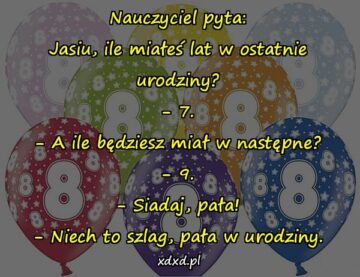 Nauczyciel pyta: Jasiu, ile miałeś lat w ostatnie urodziny? – 7. – A ile będziesz miał w następne? – 9. – Siadaj, pała! – Niech...
