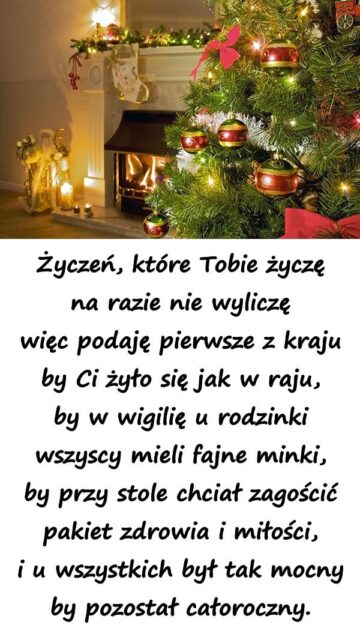 Życzeń, które Tobie życzę na razie nie wyliczę więc podaję pierwsze z kraju by Ci żyło się jak w raju, by w wigilię u rodzinki...