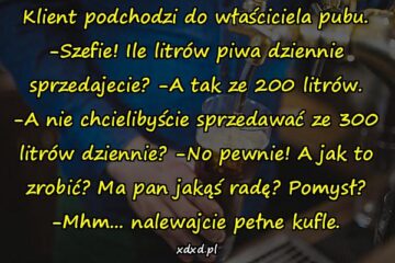 Klient podchodzi do właściciela pubu. -Szefie! Ile litrów piwa dziennie sprzedajecie? -A tak ze 200 litrów. -A nie chcielibyście sprzedawać ze 300 litrów dziennie? -No...