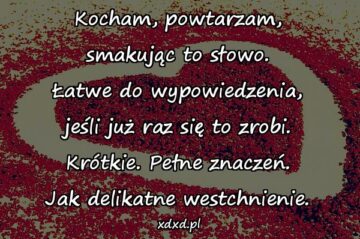 Kocham, powtarzam, smakując to słowo. Łatwe do wypowiedzenia, jeśli już raz się to zrobi. Krótkie. Pełne znaczeń. Jak delikatne westchnienie.