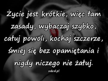 Życie jest krótkie, więc łam zasady, wybaczaj szybko, całuj powoli, kochaj szczerze, śmiej się bez opamiętania i nigdy niczego nie żałuj.