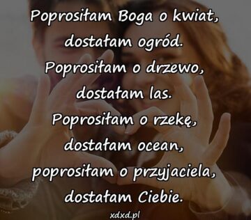 Poprosiłam Boga o kwiat, dostałam ogród. Poprosiłam o drzewo, dostałam las. Poprosiłam o rzekę, dostałam ocean, poprosiłam o przyjaciela, dostałam Ciebie.