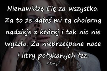 Nienawidzę Cię za wszystko. Za to że dałeś mi tą cholerną nadzieje z której i tak nic nie wyszło. Za nieprzespane noce i litry połykanych...