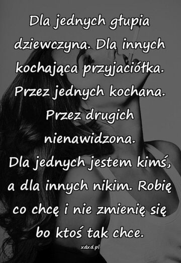 Dla jednych głupia dziewczyna. Dla innych kochająca przyjaciółka. Przez jednych kochana. Przez drugich nienawidzona. Dla jednych jestem kimś, a dla innych nikim. Robię co chcę...