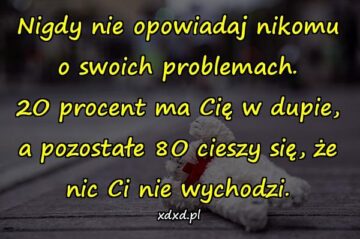 Nigdy nie opowiadaj nikomu o swoich problemach. 2O procent ma Cię w dupie, a pozostałe 😯 cieszy się, że nic Ci nie wychodzi.